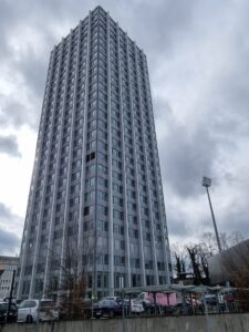From the top of the tower: Between playing games of table-football on the 28th floor, you can look at on the mountains of the Alpstein region, which is part of the Pre-Alps. The mountain shown is the Säntis – which is the highest mountain in the Ostschweiz (Eastern Switzerland).