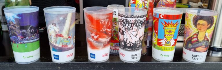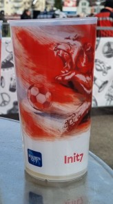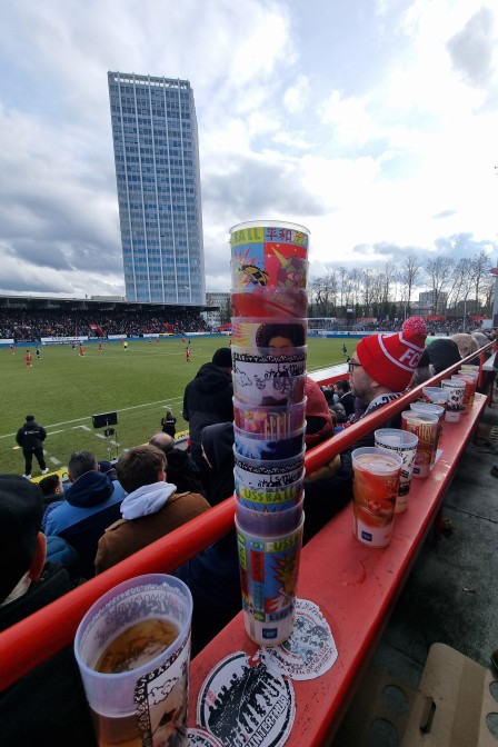 Looking up: A tower of FC Winterthur beer cups creates completion for the 28 floor Sulzer- Hochhaus tower (also known as the Wintower) which overlooks the FC Winterthur stadium.