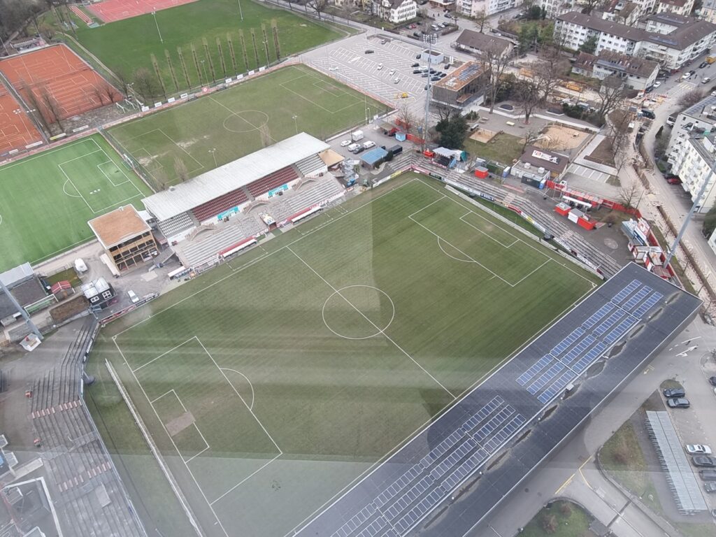Looking down: I took this photo from the top of the Sulzer-Hochhaus tower which shows the FC Winterthur stadium nestling in the streets of the town. The official name of the stadium is the “Schützenwiese“, however it’s referred to as the “Schützi“ in the local dialect.